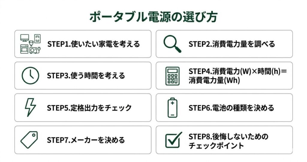 実際に子どもとポータブル電源を使った私が、初めての方にもわかりやすく選べる8ステップにまとめました。