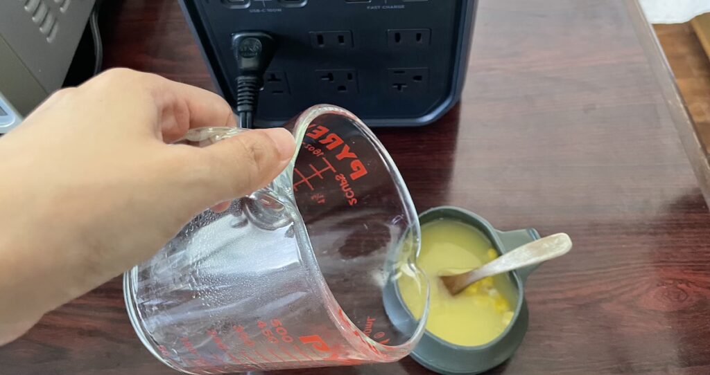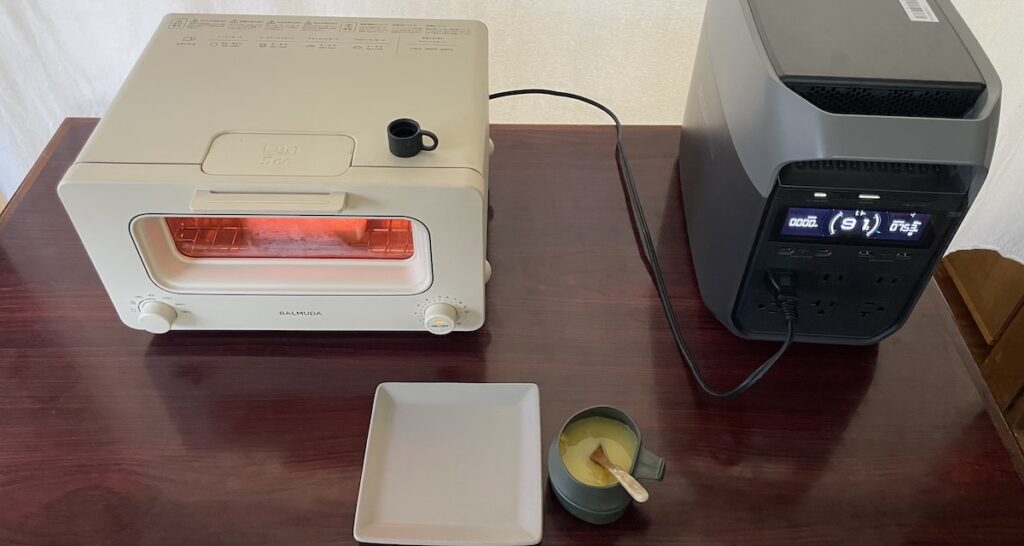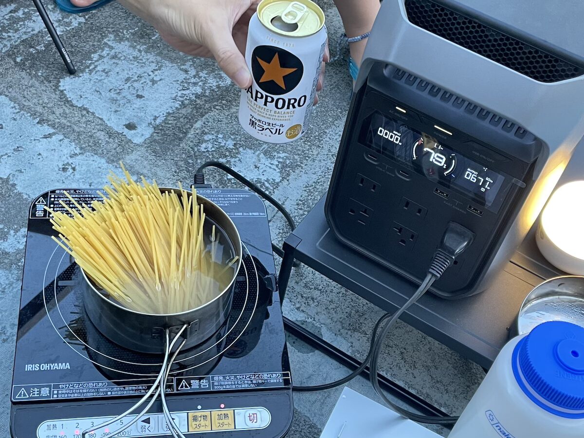 結論、これだけのごはん+αを楽しめました。今回使ったのは、容量(=ためておける電気の量)1000Whのタイプ。