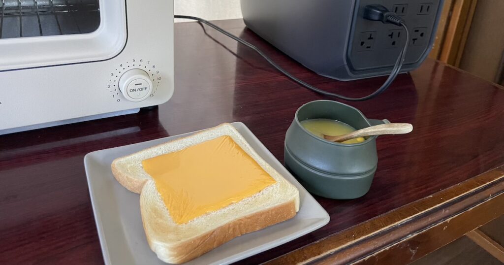 次の日の朝ごはんも、キャンプに行ったつもりで、ポータブル電源を使ってみました。